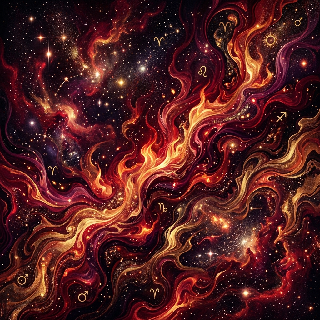 Through mix-blend-mode: screen, the pure black voids vanish, revealing the flames beneath, while the sacred gold geometry stands luminescent.